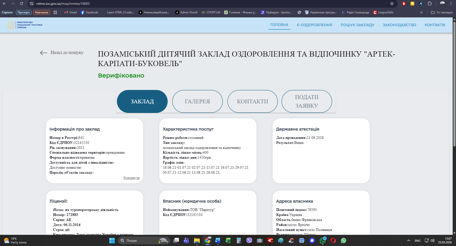 https://rstmo.ioc.gov.ua/mop/review/18003 Позаміський дитячий заклад оздоровлення та відпочинку "Артек-Карпати-Буковель". На сайті Міністерства соціальної політики України, у розділі «Є-оздоровлення-державна програма оздоровлення дітей» Вартість ліжко-дня:1450грн. (скріншот додається.)