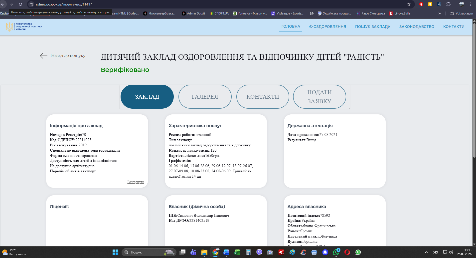 https://rstmo.ioc.gov.ua/mop/review/11417 Дитячий заклад оздоровлення та відпочинку дітей "РАДІСТЬ". На сайті Міністерства соціальної політики України, у розділі «Є-оздоровлення-державна програма оздоровлення дітей» Вартість ліжко-дня:1650грн.