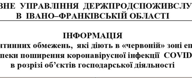 Головне управління Держпродспоживслужби в Івано - Франківській області інформує щодо карантинних обмежень, які діють в "червоній" зоні епідемічної небезпеки поширення коронавірусної інфекції COVID-19, в розрізі суб'єктів господарської діяльності.