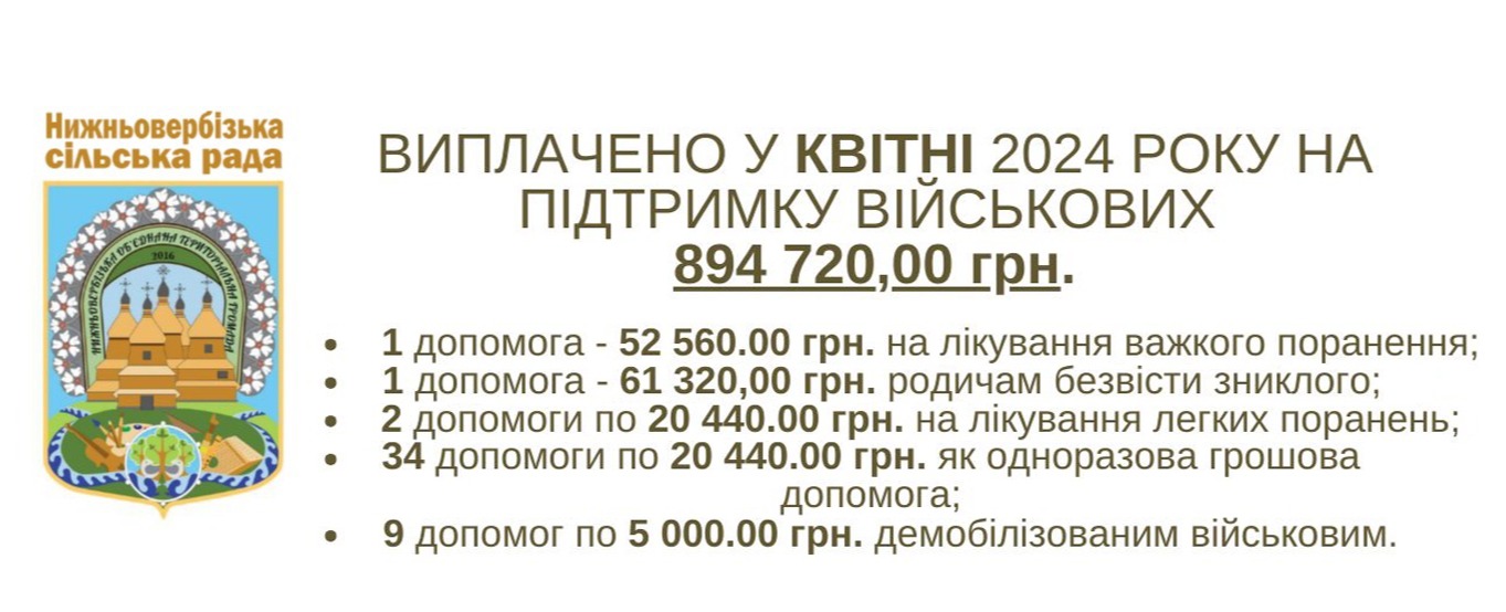 У квітні 2024 року військовослужбовцям Нижньовербізької громади, згідно поданих заяв, виплачено суму у розмірі 𝟖𝟗𝟒 𝟕𝟐𝟎,𝟎𝟎 грн.