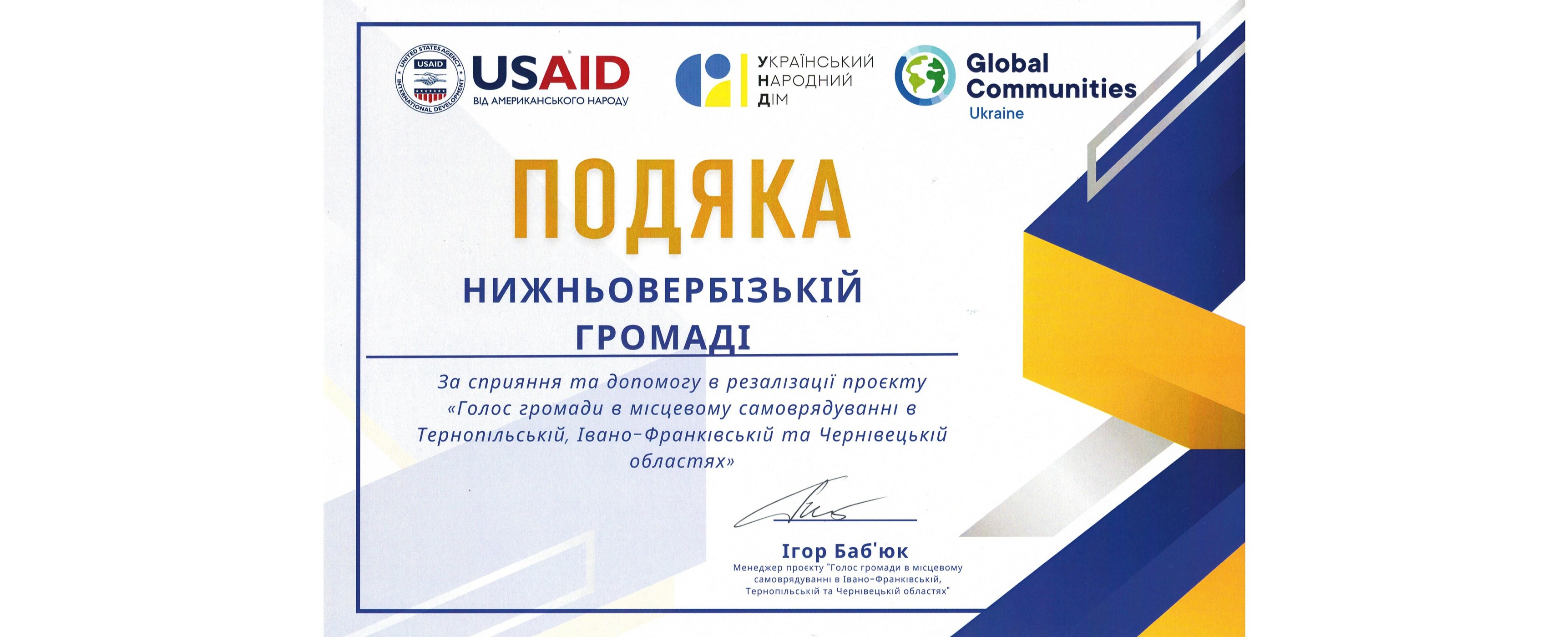 Нижньовербізька громада, як одна з трьох громад Івано-Франківської області, що є учасником Програми DOBRE отримала подяку за сприяння та допомогу в реалізації проєкту та підвела підсумки співпраці з Український Народний Дім у Чернівцях .