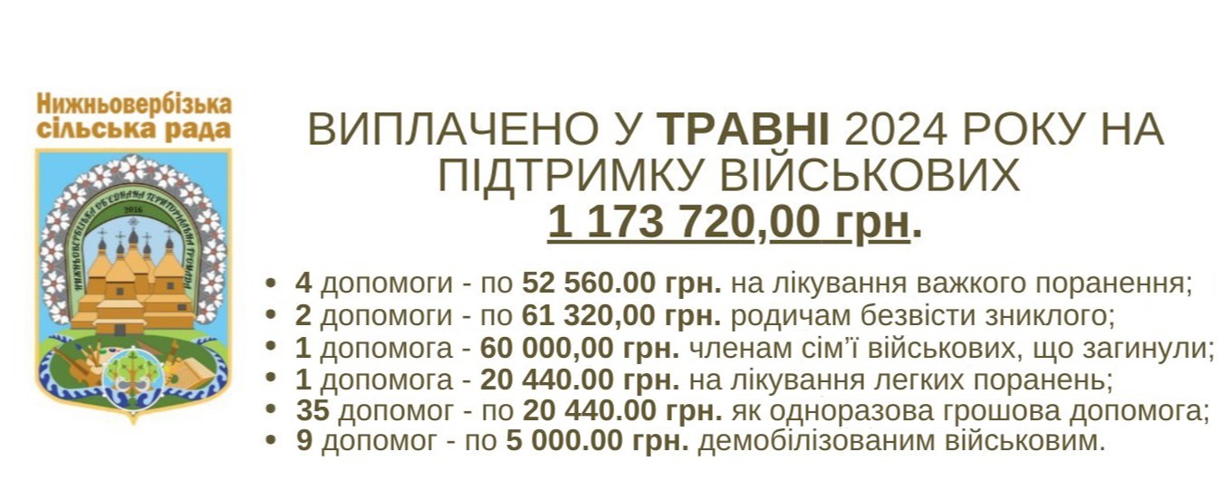 У травні 2024 року військовослужбовцям Нижньовербізької громади, згідно поданих заяв, виплачено суму у розмірі 𝟏 𝟏𝟕𝟑 𝟕𝟐𝟎 грн.