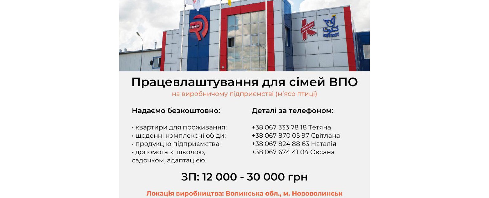 Пропонуємо сім’ям ВПО працевлаштування на нашому підприємстві за адресою Волинська обл., м. Нововолинськ та надаємо безоплатно квартири для проживання та безоплатне харчування.